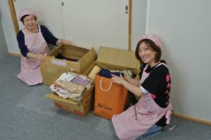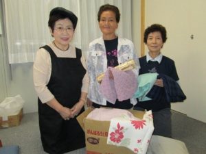東京都大田区の水流様から大槌町の各仮設住宅で行われるイベントに使ってもらえるようにといただいた反物を大槌町安渡仮設住宅の越田ミサ様(写真中央)と小国チエ様(写真右)に贈呈いたしました。