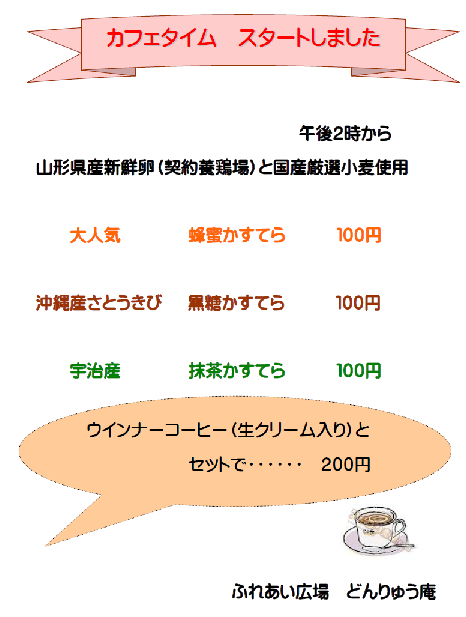 2012年6月21日 どんりゅう庵にて、午後2時からカフェタイムを始めました。ウインナーコーヒーとカステラが新たなメニューとして増えました。 写真:カステラとウインナーコーヒー FacebookXCopy