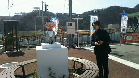 写真は、どんりゅう庵新施設を設計監督する上田知正東京造形大学教授と藤清工務店さん。2枚目は大槌駅前に建つ「ひょうたん島」初代大統領のドン・ガバチョ像と上田先生のツーショット。3、4枚目は鉄筋が整然と敷き詰められた基礎です。