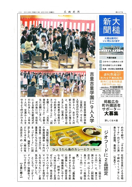 岩手県大槌町の週刊地方紙の大槌新聞が、平成31年4月10日付第1面に「ジオフードに2品認定」の見出しで、弊機構直営のコミュニティ・ハウスどんりゅう庵の「ひょうたん島カレ-」がジオフードに認定されたことを報じました。
