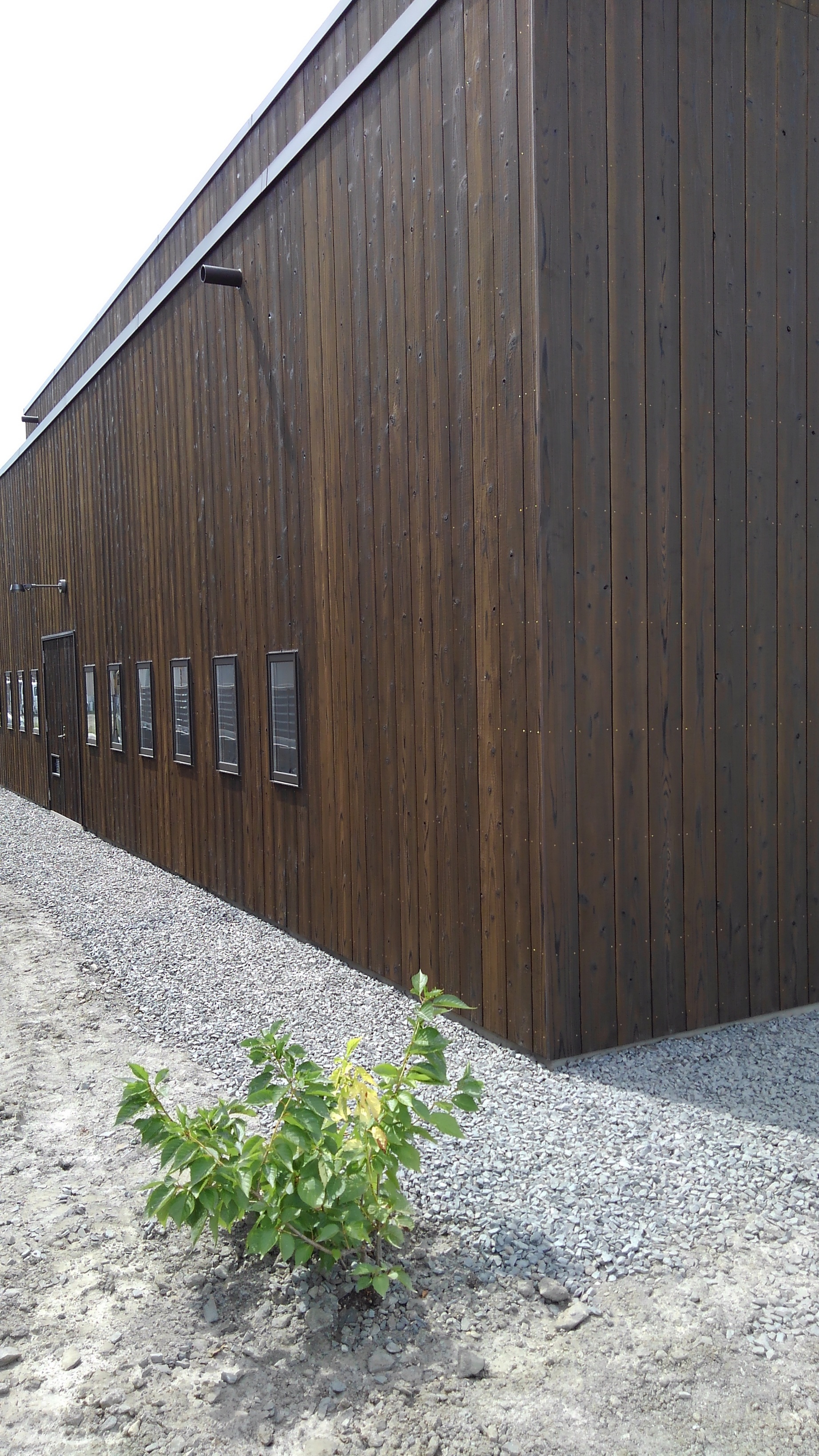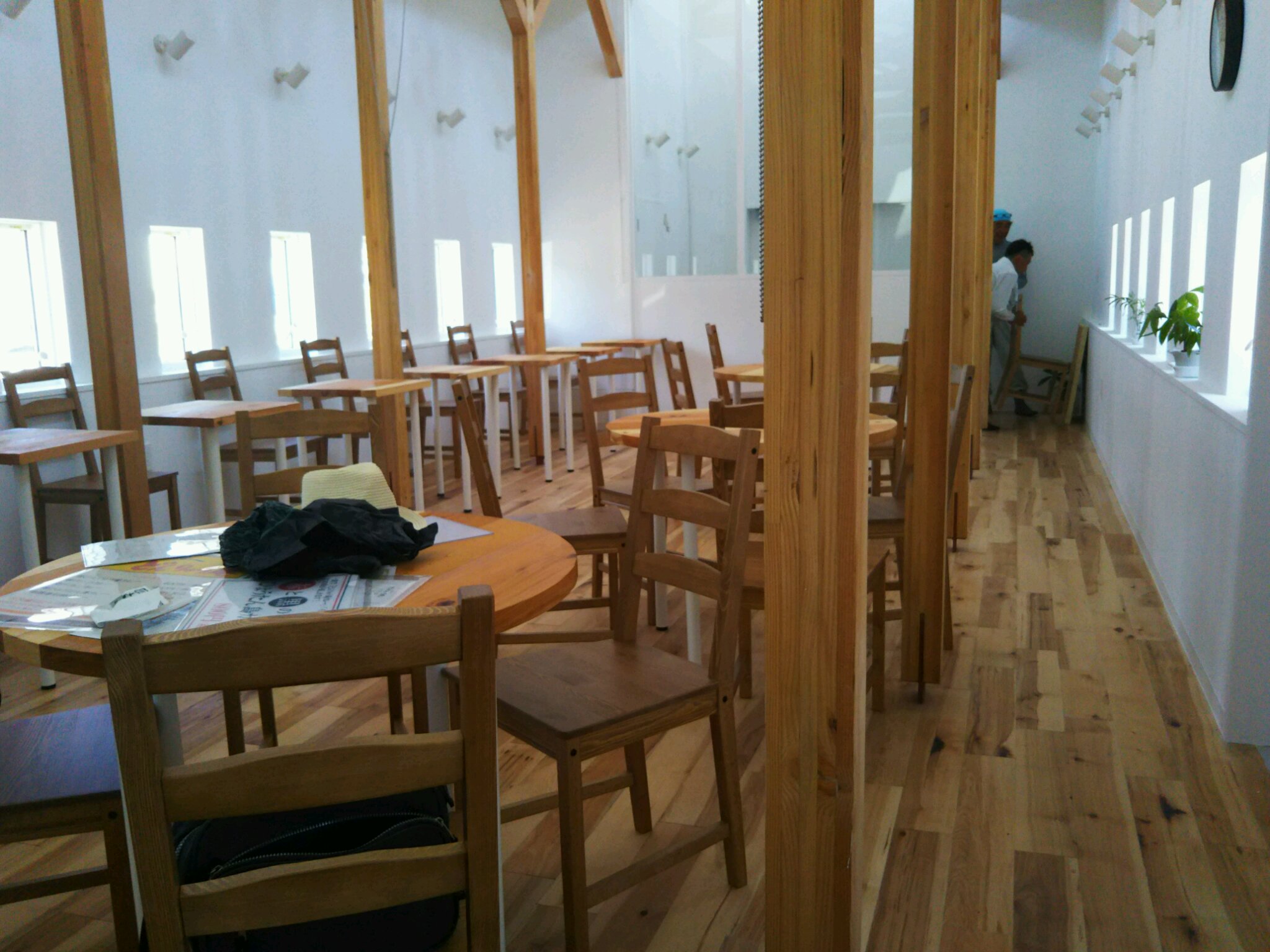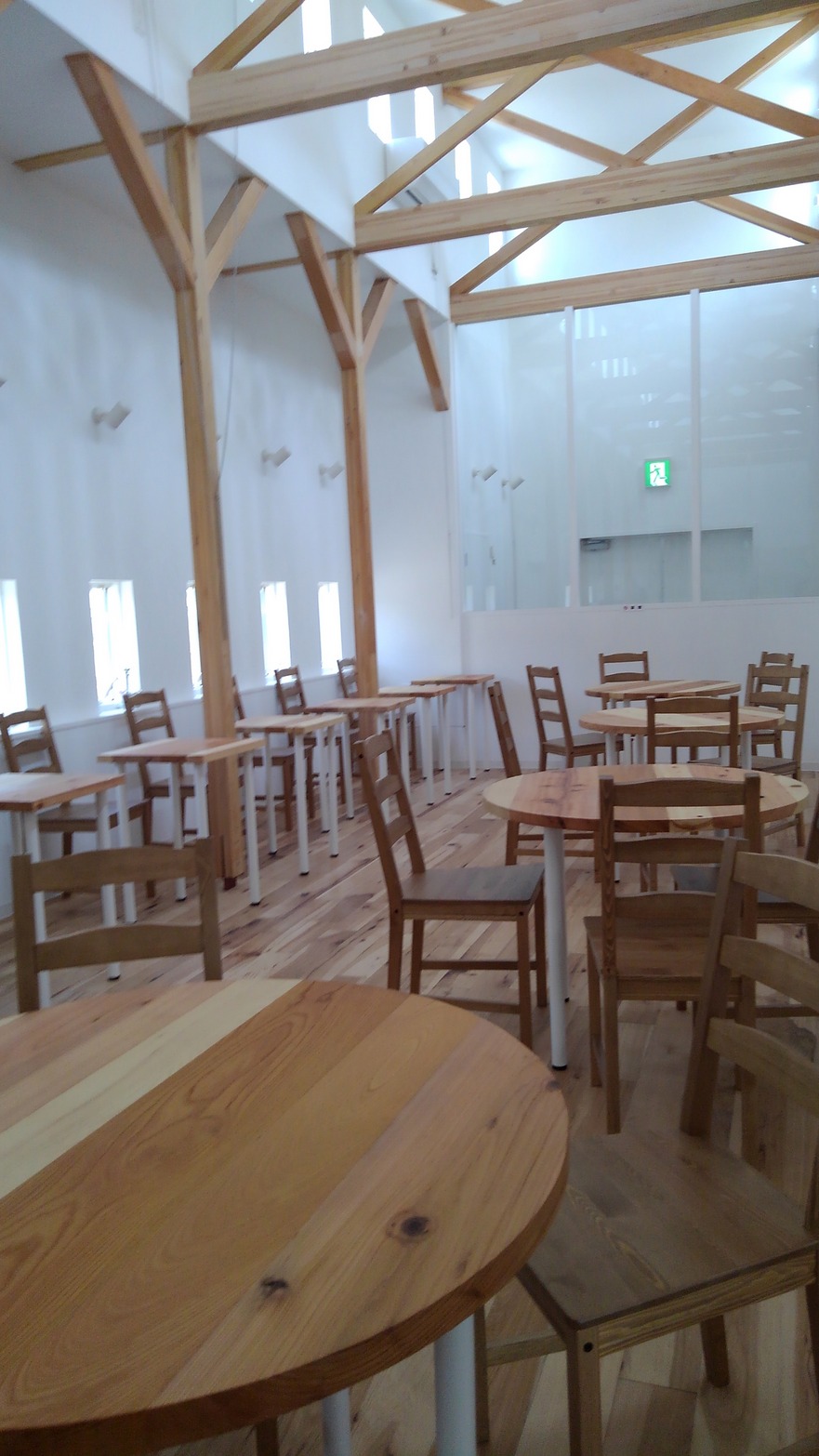 焼杉で真っ黒な外壁とは対照的に、内部は白い壁、数多い小窓からの光と高い天井で明るく、床、柱、梁、椅子、机がすべて木製なので温かい雰囲気のしかも落ち着いた作りになっています。