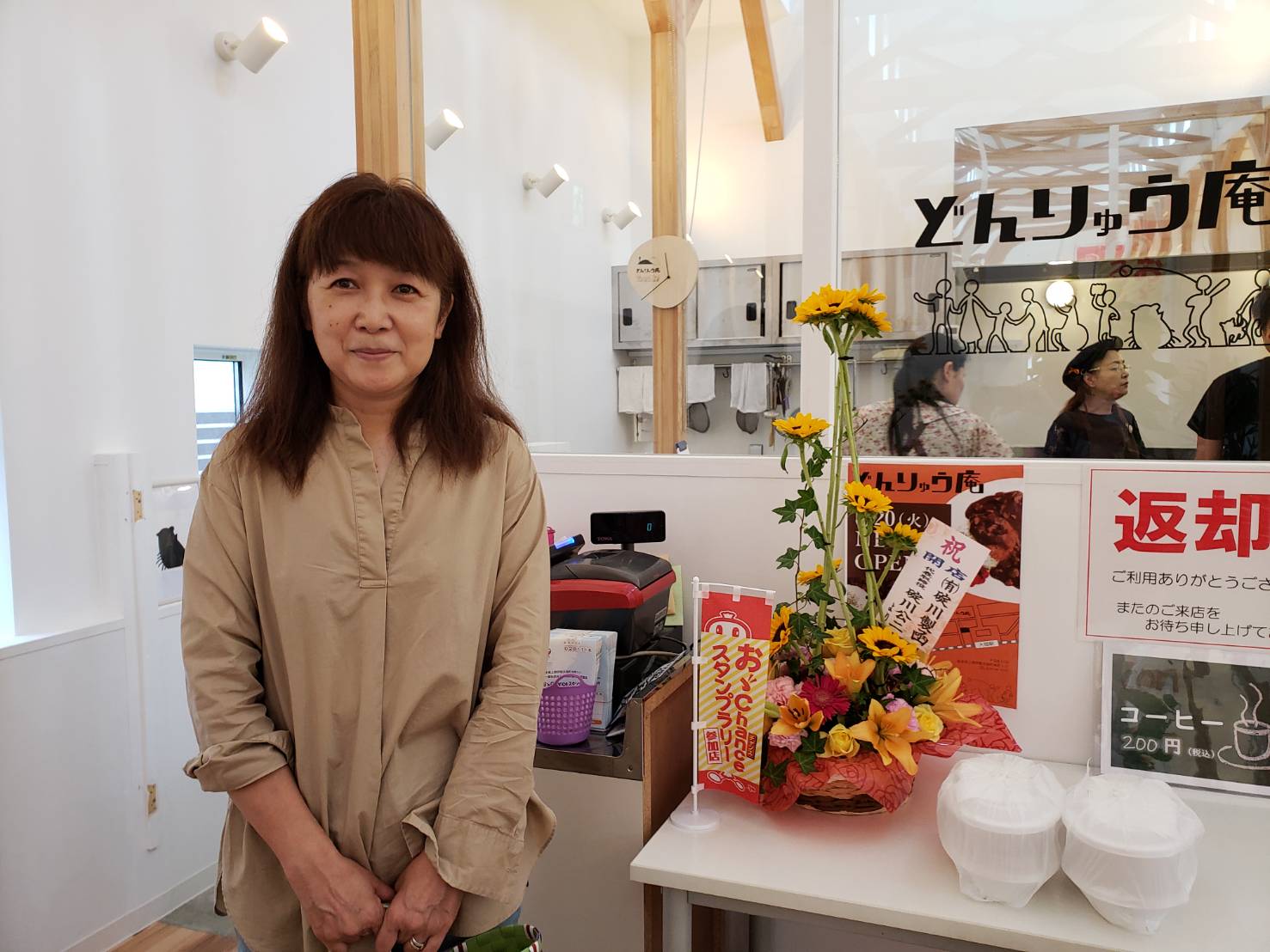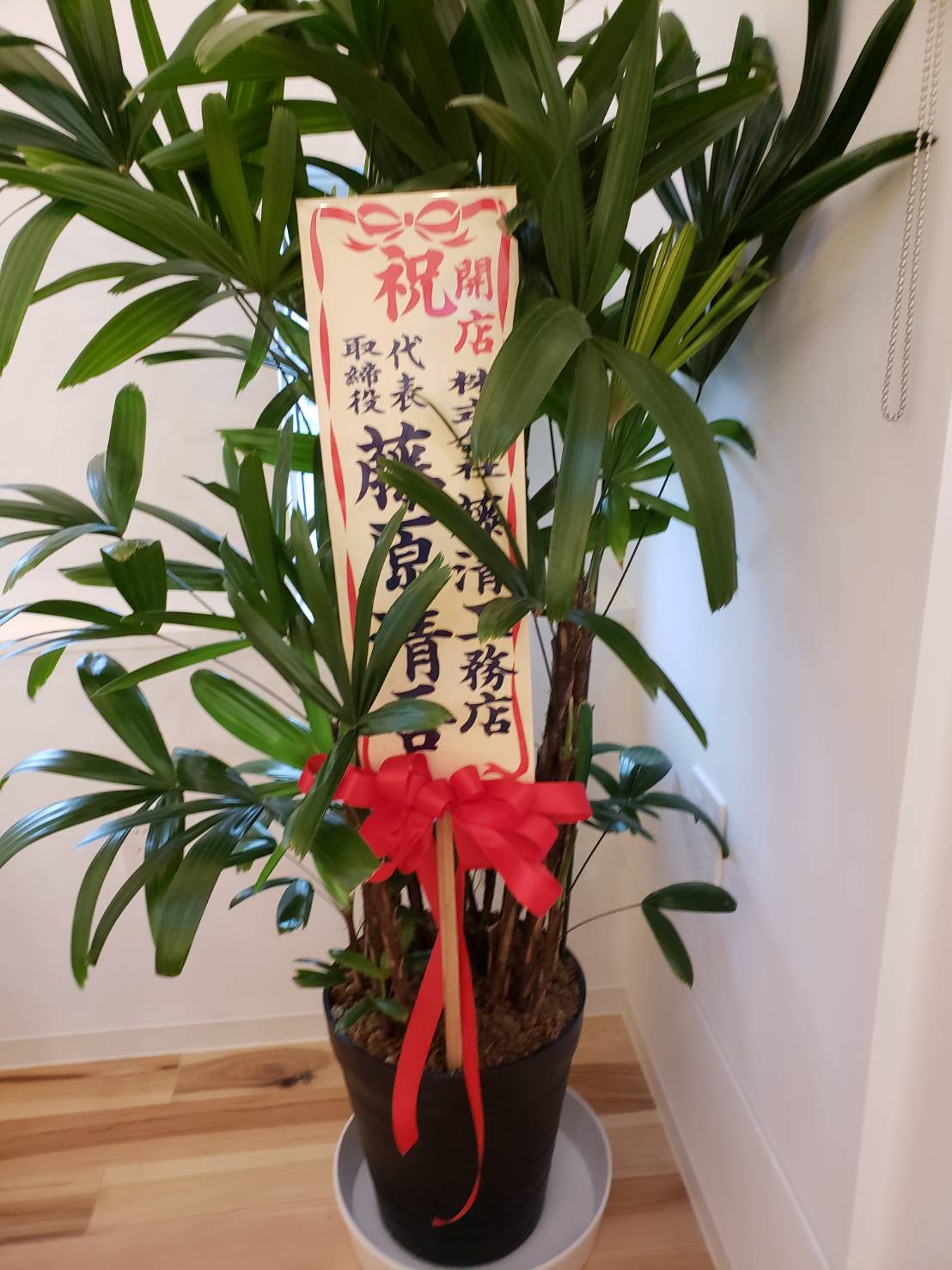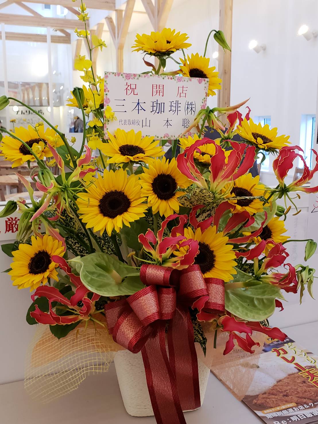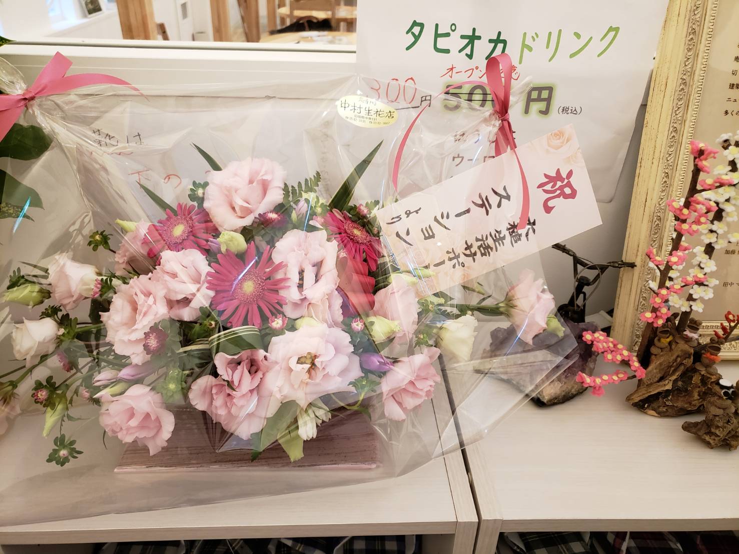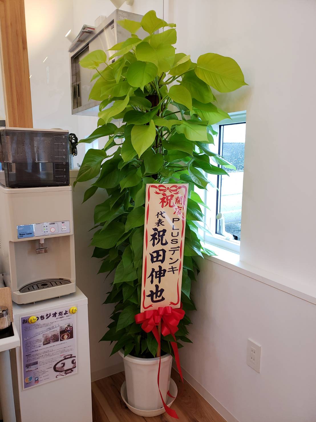 店内には多くの観葉植物や生け花などの開店祝いが関係者・取引先から贈られていました。