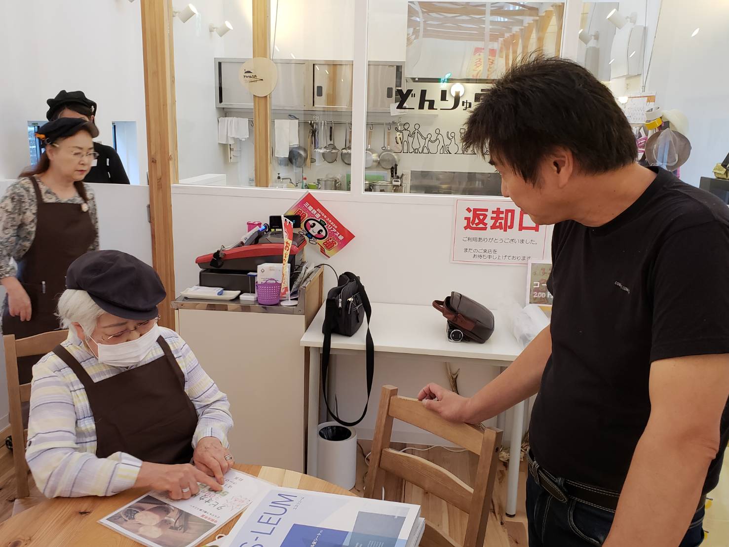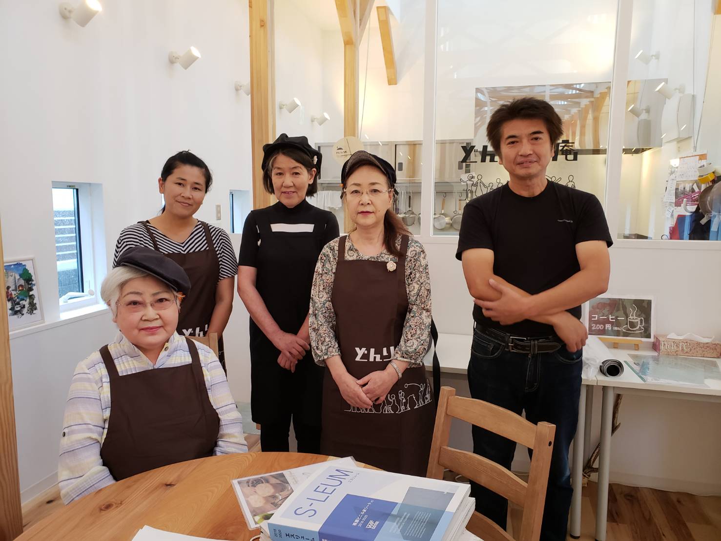 植山竜太郎職員と新スタッフの金崎さんを加えた5名全員が勢揃いして開店準備です。