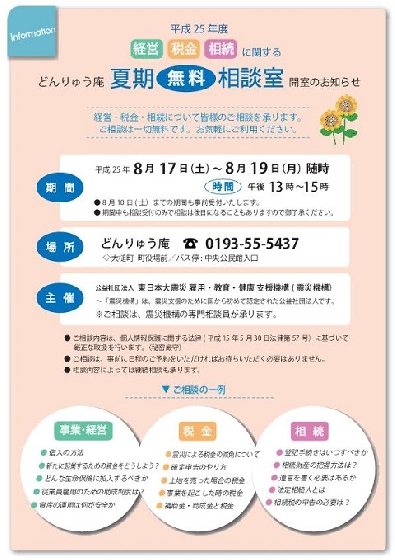 8月17日(土)〜8月19日(月)の三日間午後13時〜15時、震災機構が主催する夏期無料相談室が,大槌町どんりゅう庵で開室されます。