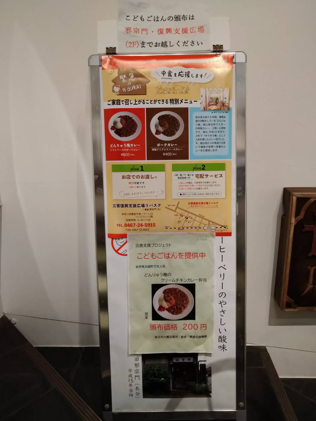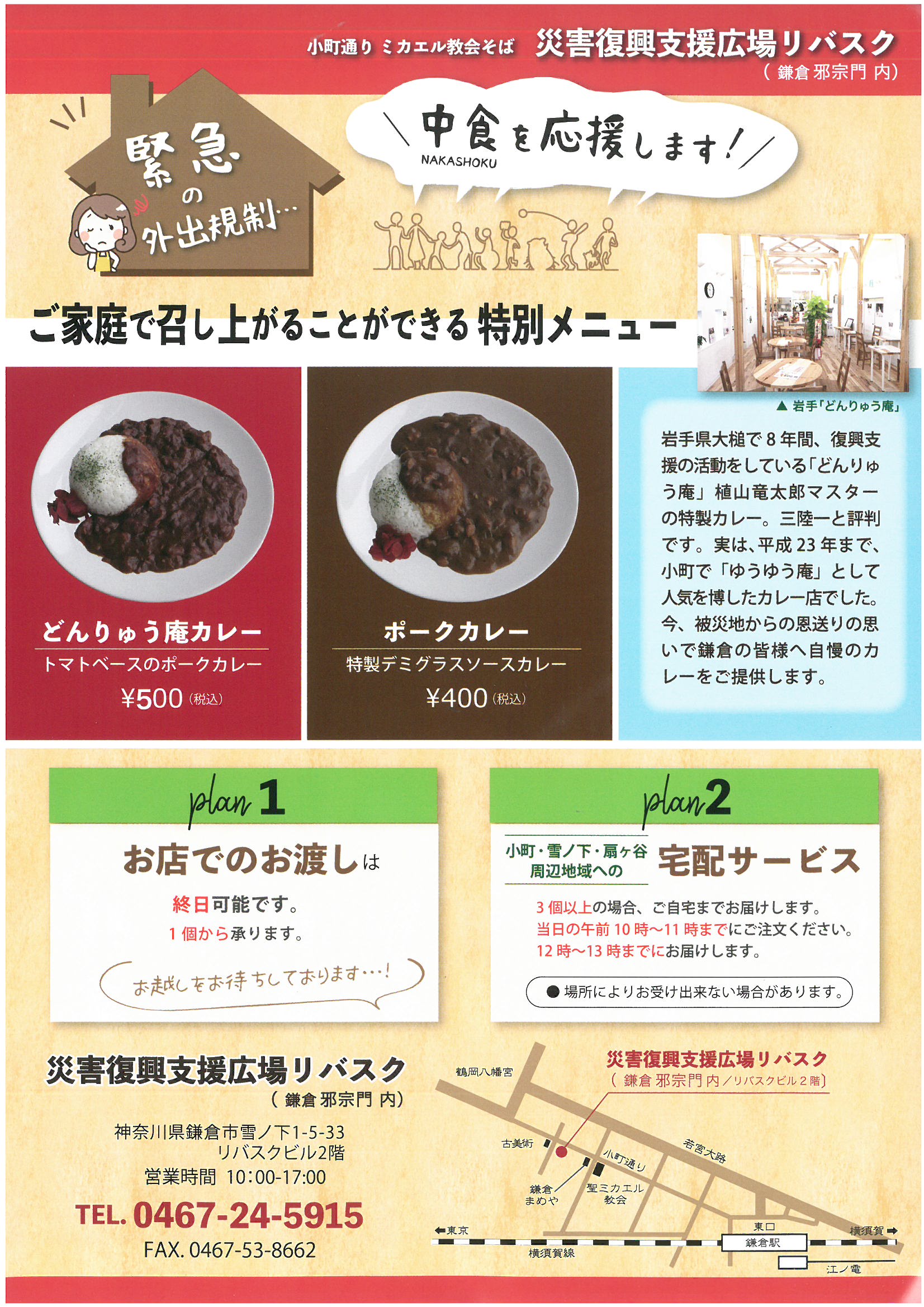 コロナウイルス被害で外出が規制される中、令和2年3月31日(火)より鎌倉小町通りのリバスク(災害復興支援広場)で「どんりゅう庵カレー」の宅配サービスが始まりました。宅配は小町・雪の下・扇ガ谷周辺地域になります。