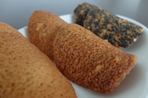 日本の瓦せんべいのような食感が楽しめる、洋風のうす焼きクッキーです。味は「ココナッツ」「バナナ」「ごまとくるみ」の3種類。どれも封を開けると豊かな風味が漂い、口に入れると独特の甘味が広がります。