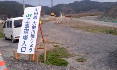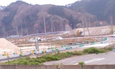 ○昨年3月、JR山田線の宮古ー釜石間の三陸鉄道への移管が決定し、復旧工事が始まっています。仕事の合間に大槌川橋梁工事の様子を見て来ました。線路は以前列車が走っていた盛土を補強して再利用するようで、遠くにカーブの見えるところに線路が出来るようです。