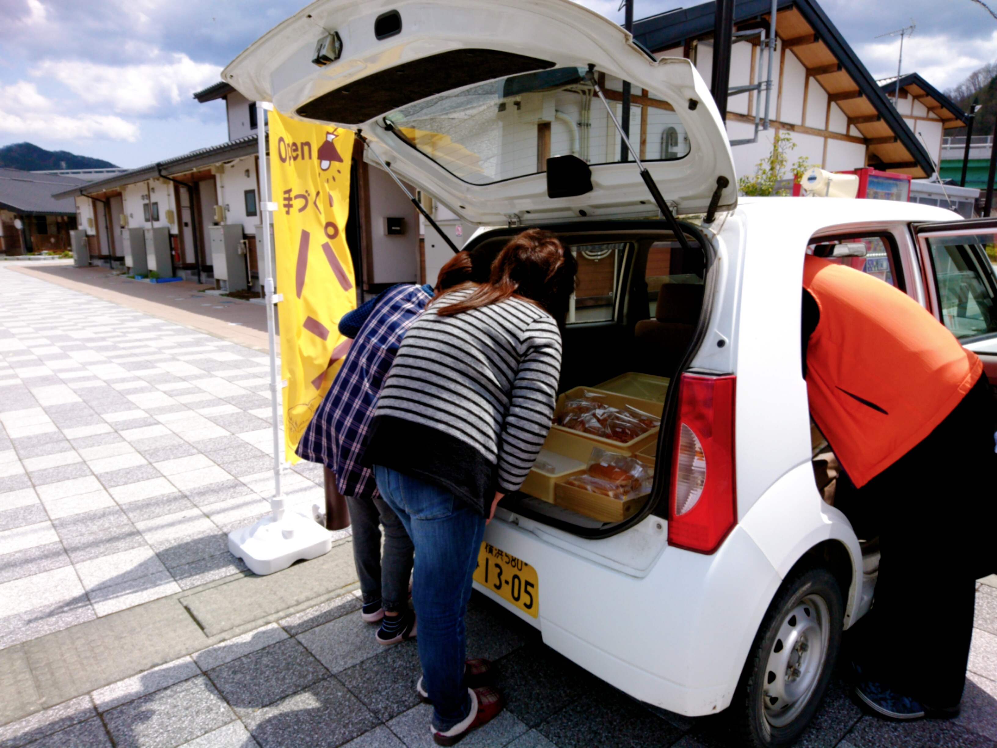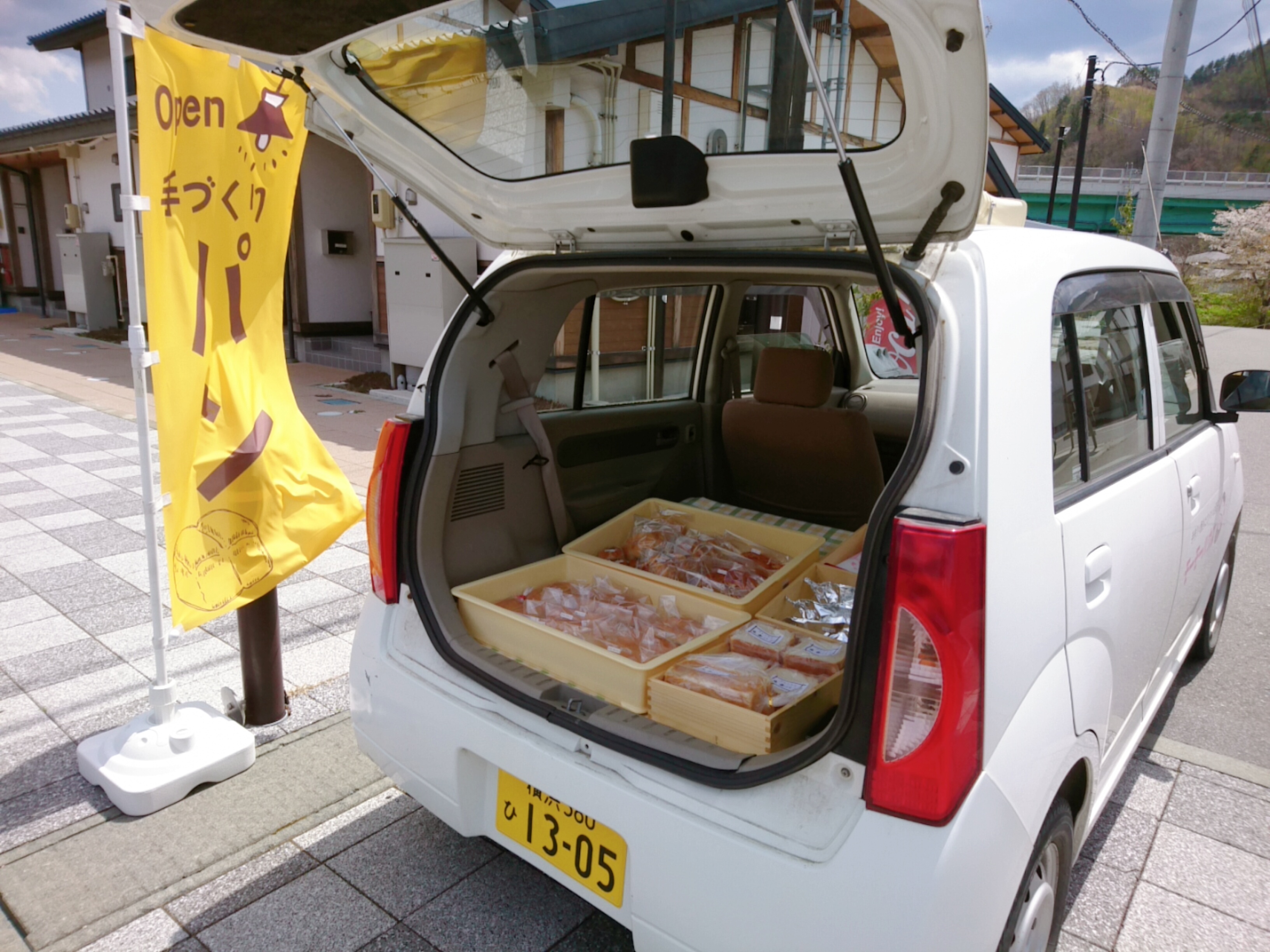 「手作りパン」の幟と、パンを満載したモーモー号