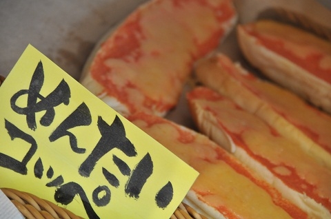 コッペパンを半分に切ったものに、明太子とチーズをのせて、焼いたものです。