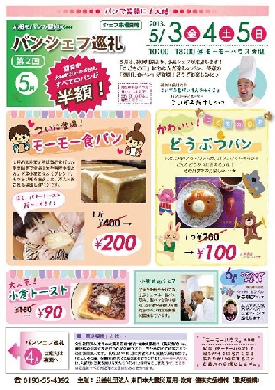5月3日(金)から5日(日)までの3日間、大槌町、モーモーハウスで第2回パンシェフ巡礼が開催されます。