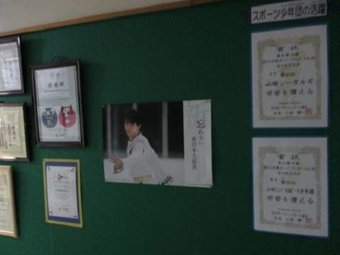 岩手県の山田町教育委員会様の山田町立織笠(おりかさ)小学校様が、羽生選手の復興支援ポスターを掲示して下さいました。