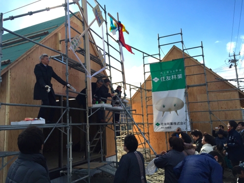 今日の午後「モーモーハウス大槌」の向かい(道路をはさんで海側)で上棟式が行われ、にぎやかに紅白のお餅がまかれました。