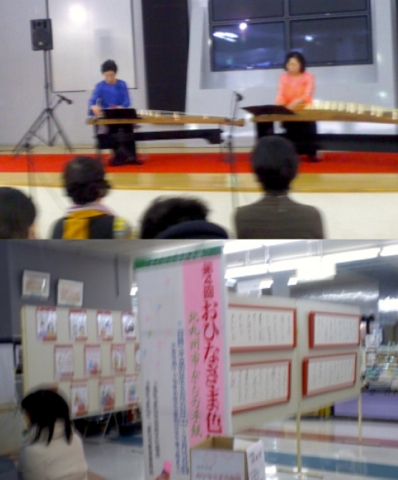 震災後、北九州市から寄贈されたおひな様の色紙や書家による額や、励ましの巻き手紙などが展示されている中での演奏です。