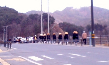 そしてちょうど地震のあった時間、外から太鼓の音と読経の声が聞こえてきました。どんりゅう庵の前の道に出てみると、30人ほどの僧侶の方々が列をつくり過ぎていきます。私たちもまた手を合わせました。