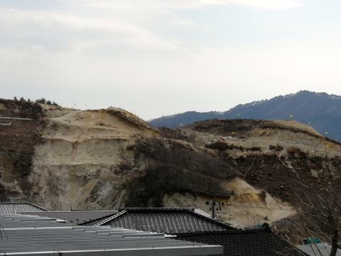 ひょっこりひょうたん島のモデルともいわれている蓬莱島を見下ろす場所に建つ仮設住宅。その向かいの山が造成や盛土への供給のためか、切り崩され、山肌があらわになっています。一歩一歩春に近づいていますが、相変わらず寒々しい風景が広がっています。