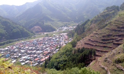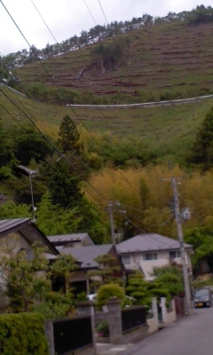 私の住んでいる大槌町桜木町は震災後、避難道路や避難場所に関して再三役場に要望を出していますが、地権、地理的問題等で未だに回答がありません。現地の様子を実際に見分するため、休日を利用して数名で裏山に登りました。町から林道への連絡道路を希望していたのですがなんと、登って自分の目で確かめましたら、とんでもない傾斜です。写真にありますように震災の山火事で木がほとんど伐採されていますが、いくらつづら折りに道路を作ったとしてもお年寄り、子供、ましてや車椅子での介助等出来そうもなく、役場も計画を見直す必要有りとの考えのようです。
