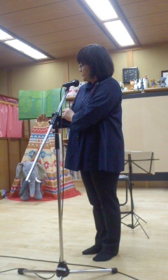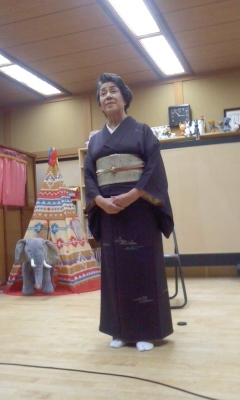 10月4日(日)大槌町の大念寺様で開かれた「チェロの語りのコンサート」の”語り”の様子をお伝えします。写真にある着物の女性は秋田市在住の谷京子様で、谷様は20代で目が不自由な人のためのリーディング・サービスを始められ、お話と歌の「グループかぜ」、朗読グループ「ぬくもり」を主宰されています。国内外での活動は高く評価され、2005年「グループかぜ」が文部科学大臣賞を受賞されています。谷様は山本周五郎の「不断草」の「読み聞かせ」をしてくださいました。「読み聞かせ」は本を全く読まずに、身振り手振りを交えてお話をされるもので、目に涙を浮かべて聞き入る方もいらっしゃいました。