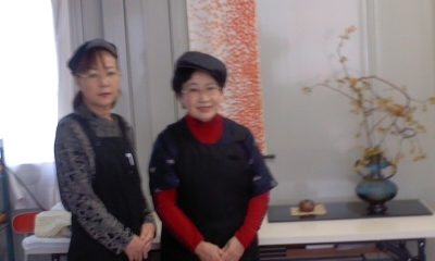 ○一番乗りのご来庵は、桜木町からこられた老ご夫婦。お抹茶を召し上がっていただきます。お菓子は「秋田のもろこし」町内のお店で買った美味しいものです。床の間飾りも季節の風情を演出しました。紅葉の飾り手ぬぐい・お花は、表具屋さんからいただいた「つる梅もどき」・花入れは青銅の耳付き「寿」飾り茶入れは季節の柿を置いてみました。