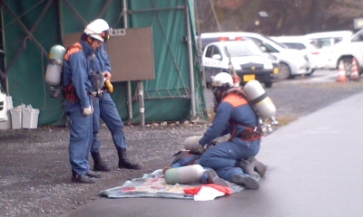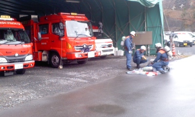 役所前にある仮設消防署の署員が酸素ボンベを背負って、被害者の救助訓練をしていました。