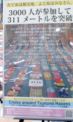 この取り組みは2013年に沿岸部の被災地住民やNPOの呼びかけで始まり、これまで19の都道府県とタイやカナダ等の海外を巡回し、布の長さは震災の起こった3月11日をイメージする311メートルを超えたということです。
