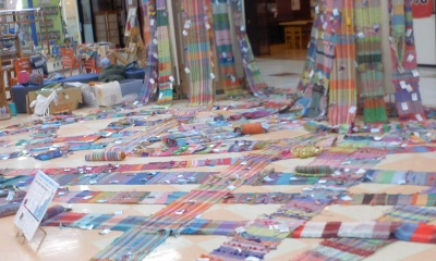 大槌町のマストで「さをり織り」の展示会が開かれました。「さをり織り」は被災地の人々と世界の人々が復興への祈りを込めて織り込んだ織物で、東北の被災地で紡いだ縦糸に各地の人々が横糸を織り込むことで布にしていきます。