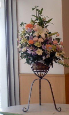 大槌町役場へデリバリーのカレーを届けに行きました。入口の花が今日から替わっていました。ユリ、カーネーション、スプレー菊(白)、トルコキキョウ等々春らしい色の花が立華風に活けられていました(凛とした姿はこれからの大槌の象徴でしょうか)。