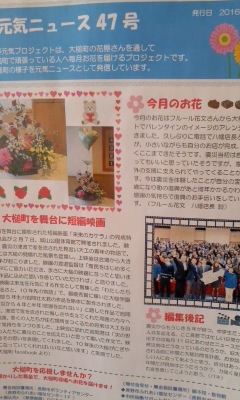 お花を贈って下さる”長野元気プロジェクト”は大槌町の生花店を通して毎月1万円の花を大槌町で頑張っている人たちへ届けるプロジェクトで、長野市のボランティアグループが運営されています。下に貼ってある「元気ニュース」のお花の写真は先月のバレンタイン用の花のようですね。