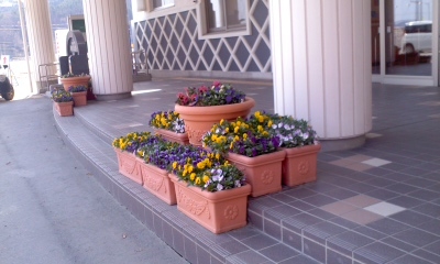 大槌町役場入口玄関前に新しくビオラのプランターが置かれ、花の植え替えも完了。春らしい花々が来客のお出迎えをしています。