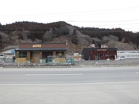 ○整備が進む大地町の漁港周辺では、地元の漁師さんたちの店舗建設も進んでいます。その中には秋になるとどんりゅう庵裏の加工場で新巻鮭を干していらっしゃる中里商店様や、弊機構が昨年6月から9月までダイエー港南台店様にて「復興支援販売所」を開設した際に海産物を販売させていただいた越田鮮魚店様の店舗兼加工場もあります。