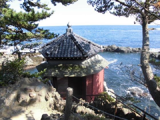 この六角堂は明治時代、東京美術学校(現在の東京芸術大学)の校長を退官して東京を離れた岡倉天心がこの海岸の景色に感動して土地を購入、自身の居宅を立てた敷地内の一番海に面した場所に建てられた建物です。