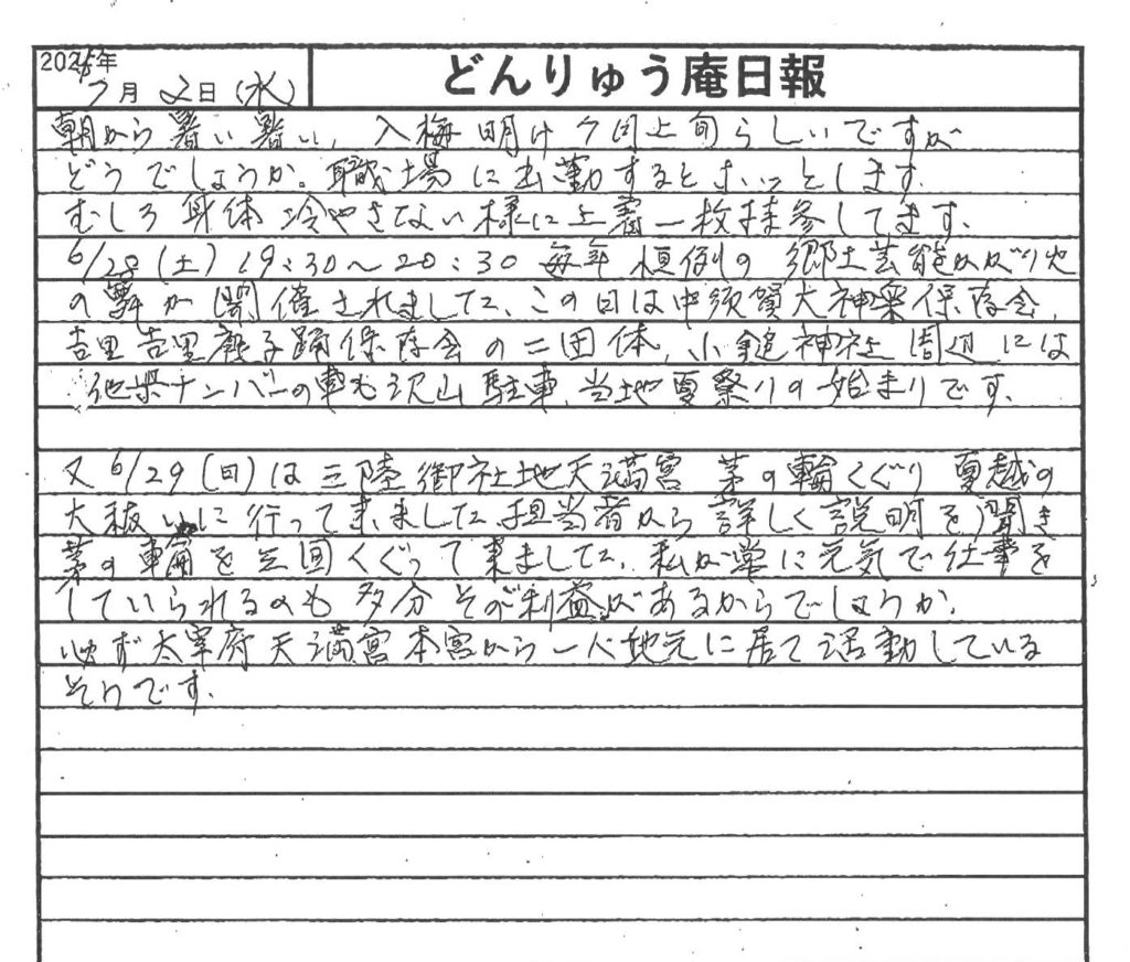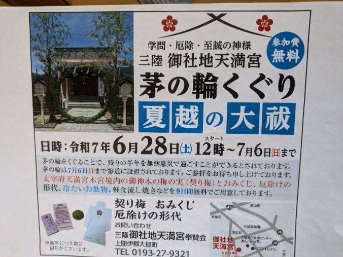 2025年7月10日 入梅明けが近づく大槌町において毎年恒例の郷土芸能かがり火の舞が開催され、三陸 御社地(おしゃち)天満宮では茅(ち)の輪(わ)くぐり 夏越の大(だい)祓(おおはらい)(はら)が行われました。その模様を震災機構のお嬢こと佐藤悦子相談役(岩手県大槌町在住)が現地報告します。 FacebookXCopy