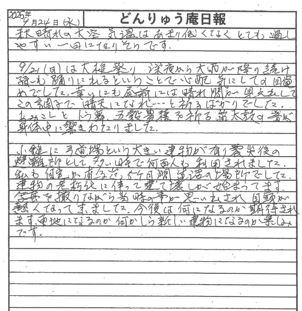 秋晴れの大槌町で、伝統の大槌祭りが盛大に開催されました。その模様と、震災時に避難所として何百人もの方々に利用され、ご自宅が損傷したご自身も5か月間避難生活を送られた弓道場の建て壊しについて、震災機構相談役で「お嬢」の愛称で親しまれている佐藤悦子さん(岩手県大槌町在住)が現地から報告します。
