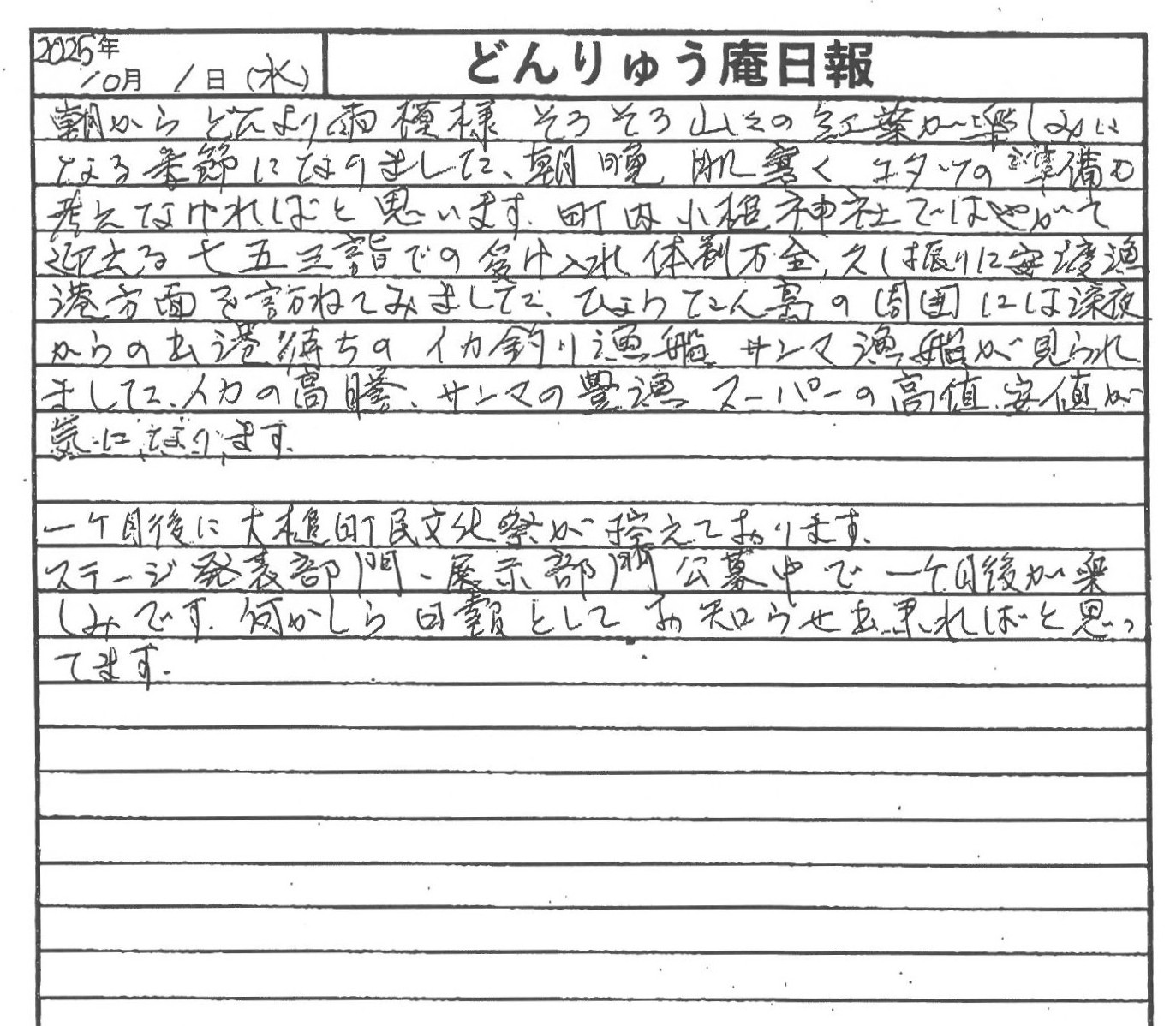 山々の紅葉が楽しみになってきた大槌の安渡(あんど)漁港や小鎚神社の様子について、震災機構相談役で「お嬢」の愛称で親しまれている佐藤悦子さん(岩手県大槌町在住)が現地から報告します。