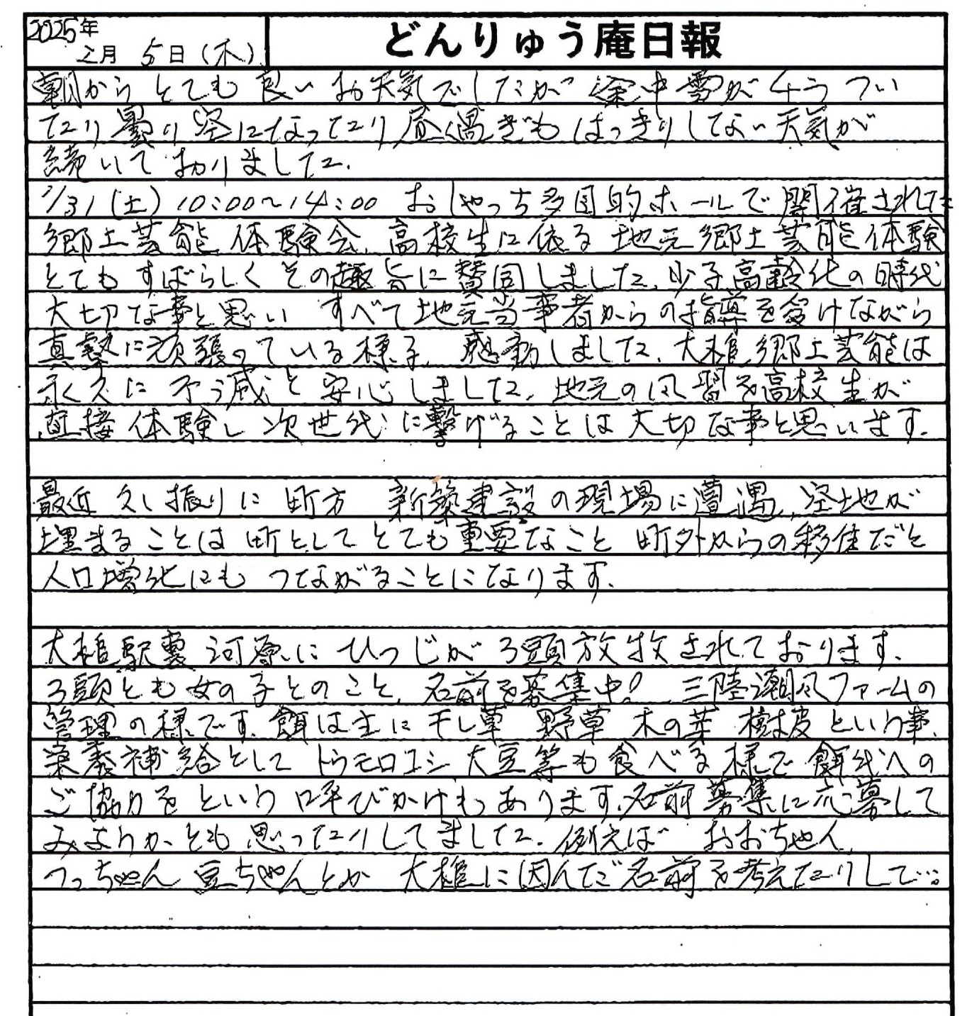晴れたかと思うと雪が降り、止むと曇り空にと、はっきりしない天気の大槌町のおしゃっち(大槌町文化交流センター)において郷土芸能体験会が開催されました。地元の高校生が伝統文化を受け継ぐ様子や、町の新築現場や放牧が始まった羊の様子などを、震災機構相談役で、「お嬢」の愛称で親しまれている佐藤悦子さん(岩手県大槌町在住)が現地の状況を報告します。