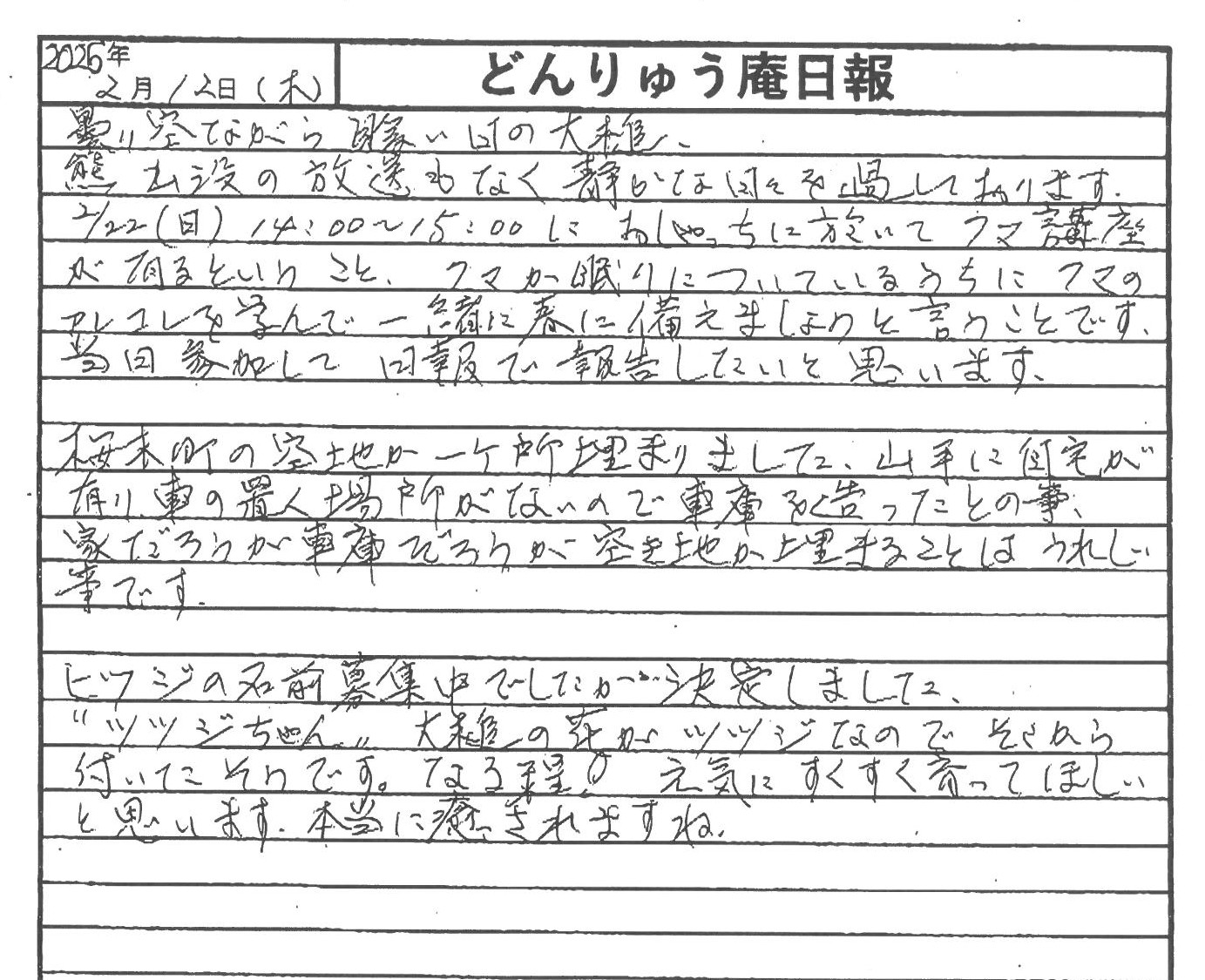 「つつじちゃん」は、大槌の花「新山つつじ」にちなんで、「さかえちゃん」は、現在の放牧地「栄町」にちなみ、「もこちちゃん」は、もこもことおおつちをミクス したそうです。 その他、クマ講座や町内の新規住宅の建築状況について、震災機構相談役で、「お嬢」の愛称で親しまれている佐藤悦子さん(岩手県大槌町在住)の現地報告です。