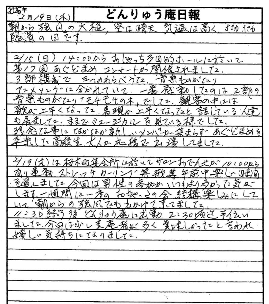 第17回あぐどまめコンサート(大槌町で活動する子ども合唱団)が、おしゃっち(大槌町文化交流センター)で開催されました。 その他、桜木町集会所で開催されたサロンおでんせの様子について、震災機構相談役で、「お嬢」の愛称で親しまれている佐藤悦子さん(岩手県大槌町在住)の現地報告です。