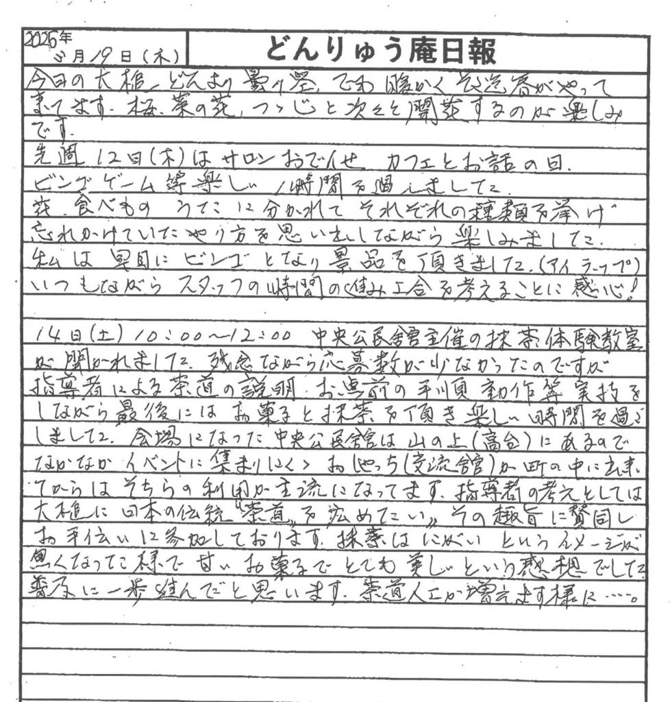 また、サロンおでんせ カフェとお話の様子について、震災機構相談役で、「お嬢」の愛称で親しまれている佐藤悦子さん(岩手県大槌町在住)からの現地報告です。