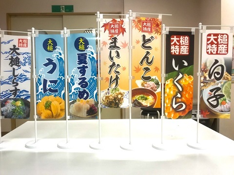 大槌町への来訪者に向けて町の「食」の魅力発信を行うため、大槌町の旬の特産品を紹介するのぼり旗が出来、町内宿泊施設や飲食店や大槌町文化交流センター(おしゃっち)・大槌商工会に設置されるそうです。