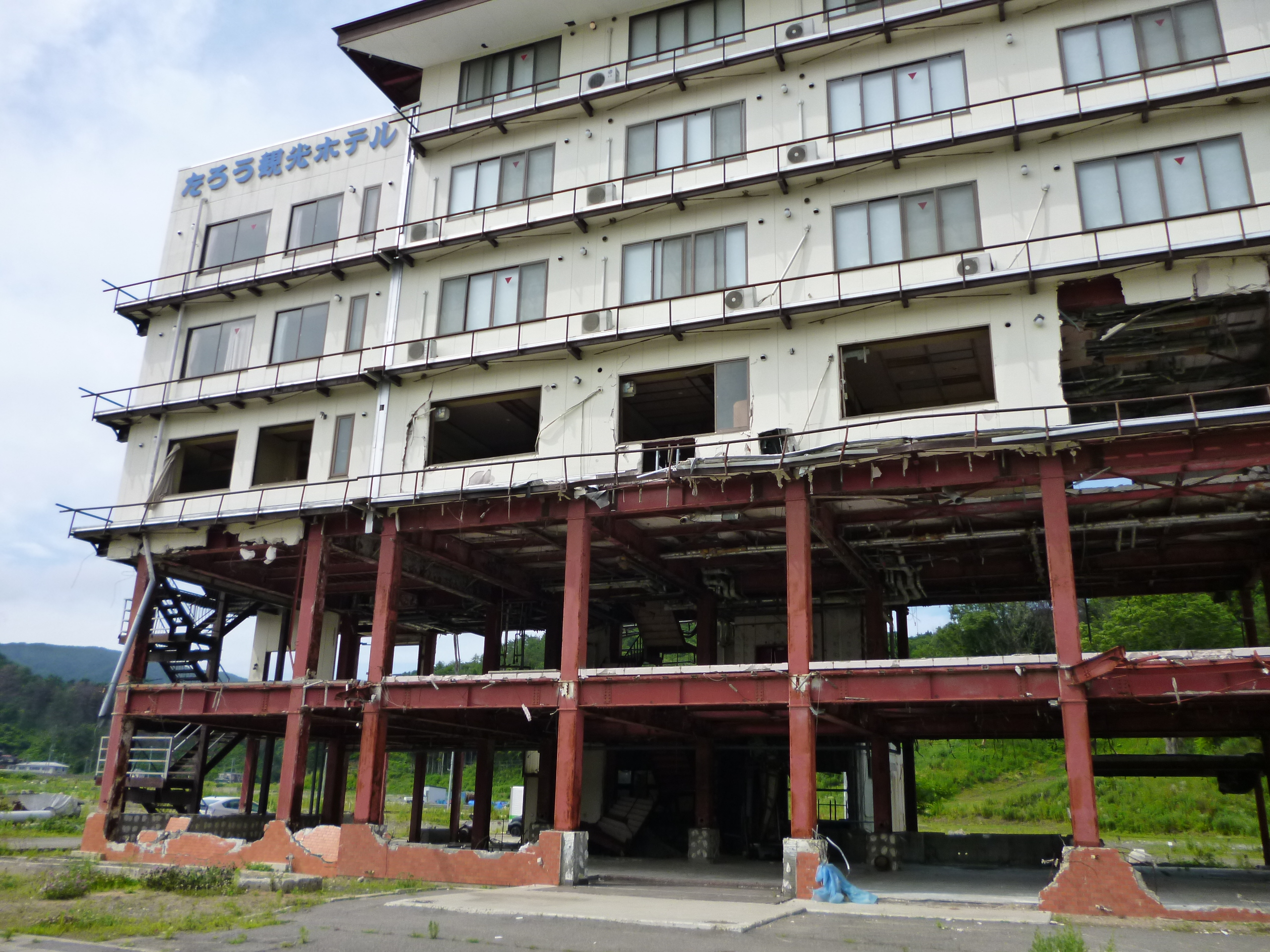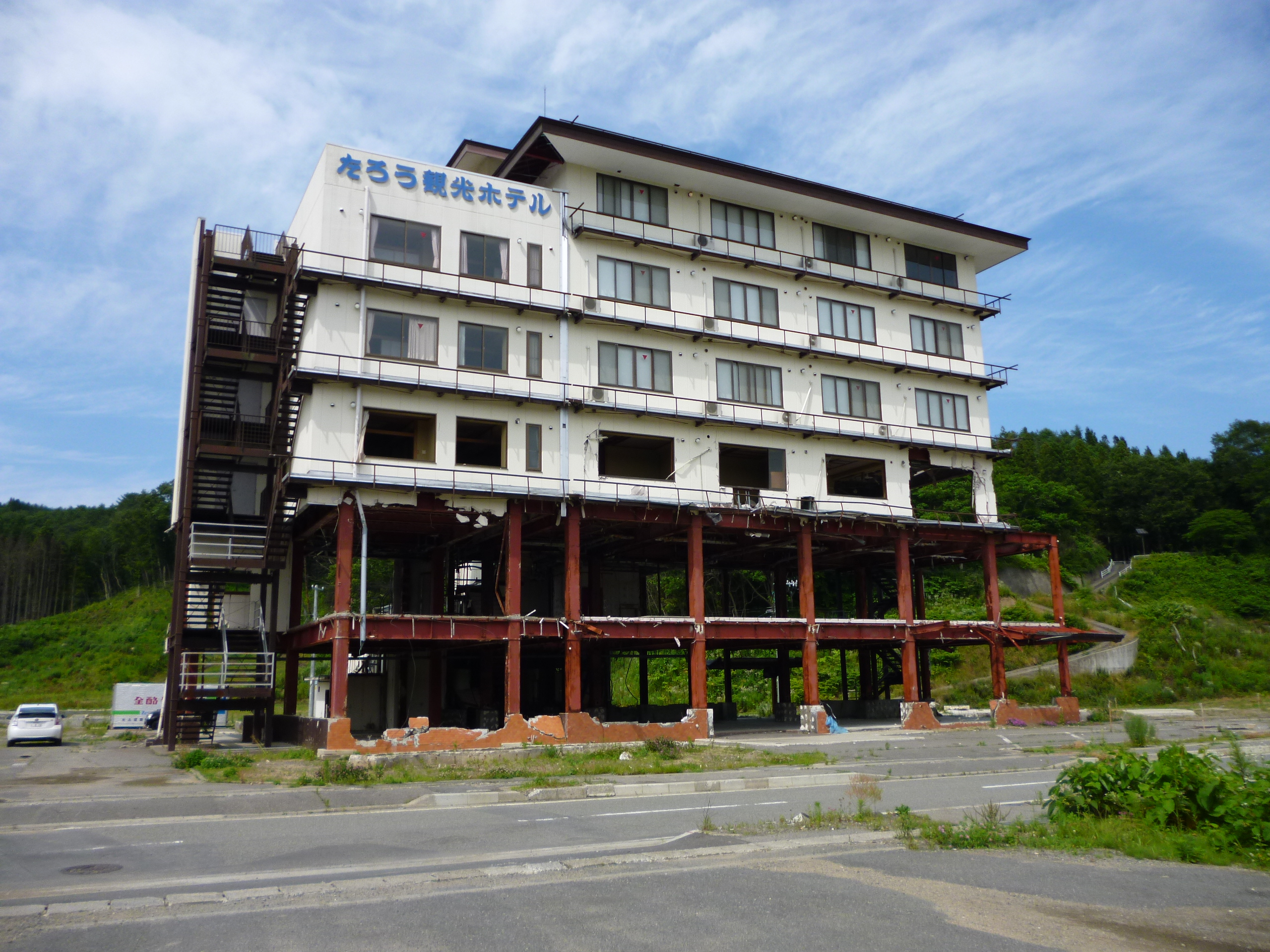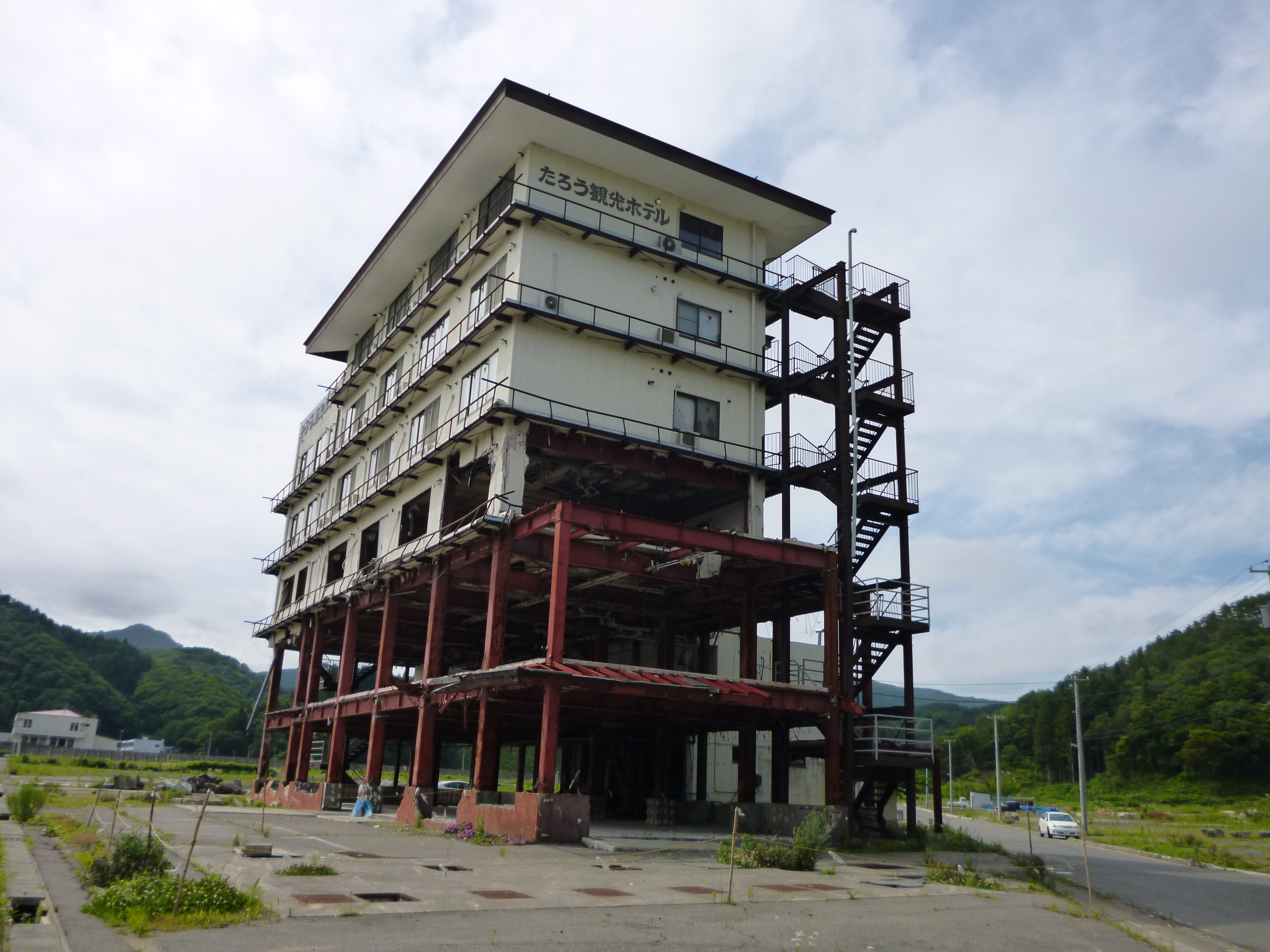 東日本大震災では、津波により決壊した防潮堤の正面に位置していた「たろう観光ホテル」は津波の直撃を受け4階まで浸水。1,2階は鉄骨だけが残され、3階部分は津波より破壊された姿をそのまま留めています。この「たろう観光ホテル」は「津波遺構」として保存され、津波の恐ろしさや破壊力を後世まで伝えることとなっています。