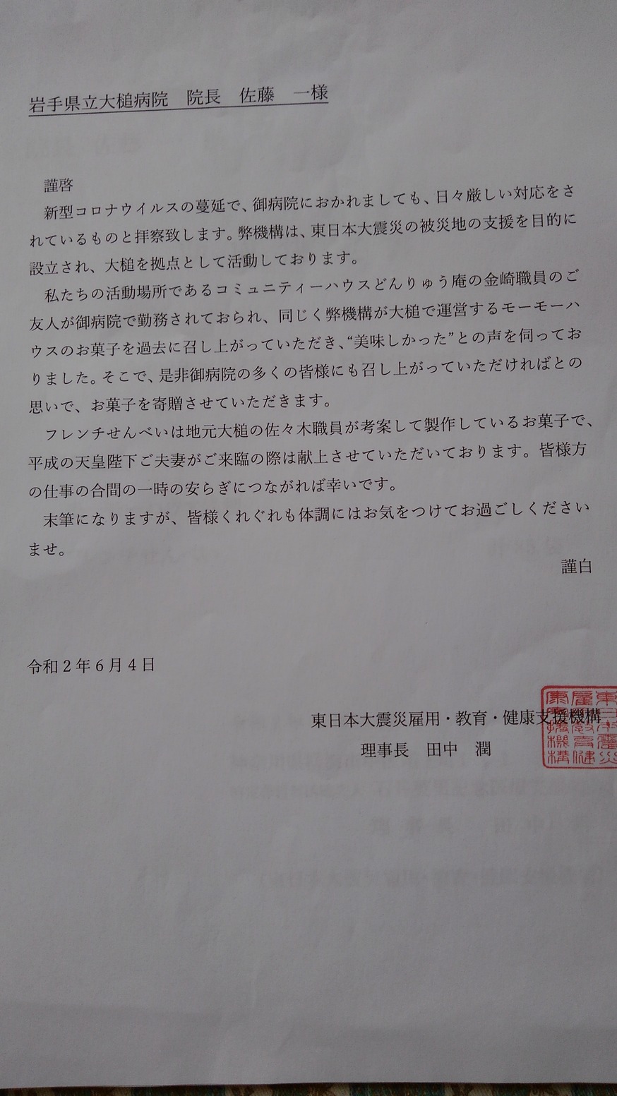 令和2年6月10日、震災機構は新型コロナウイルス感染と闘う岩手県立大槌病院に、モーモーハウスの人気焼き菓子フレンチせんべいを寄付助成しました。また、釜石での酒造り体験塾について震災機構のお嬢こと佐藤悦子特別顧問(岩手県大槌町在住)がレポートします。