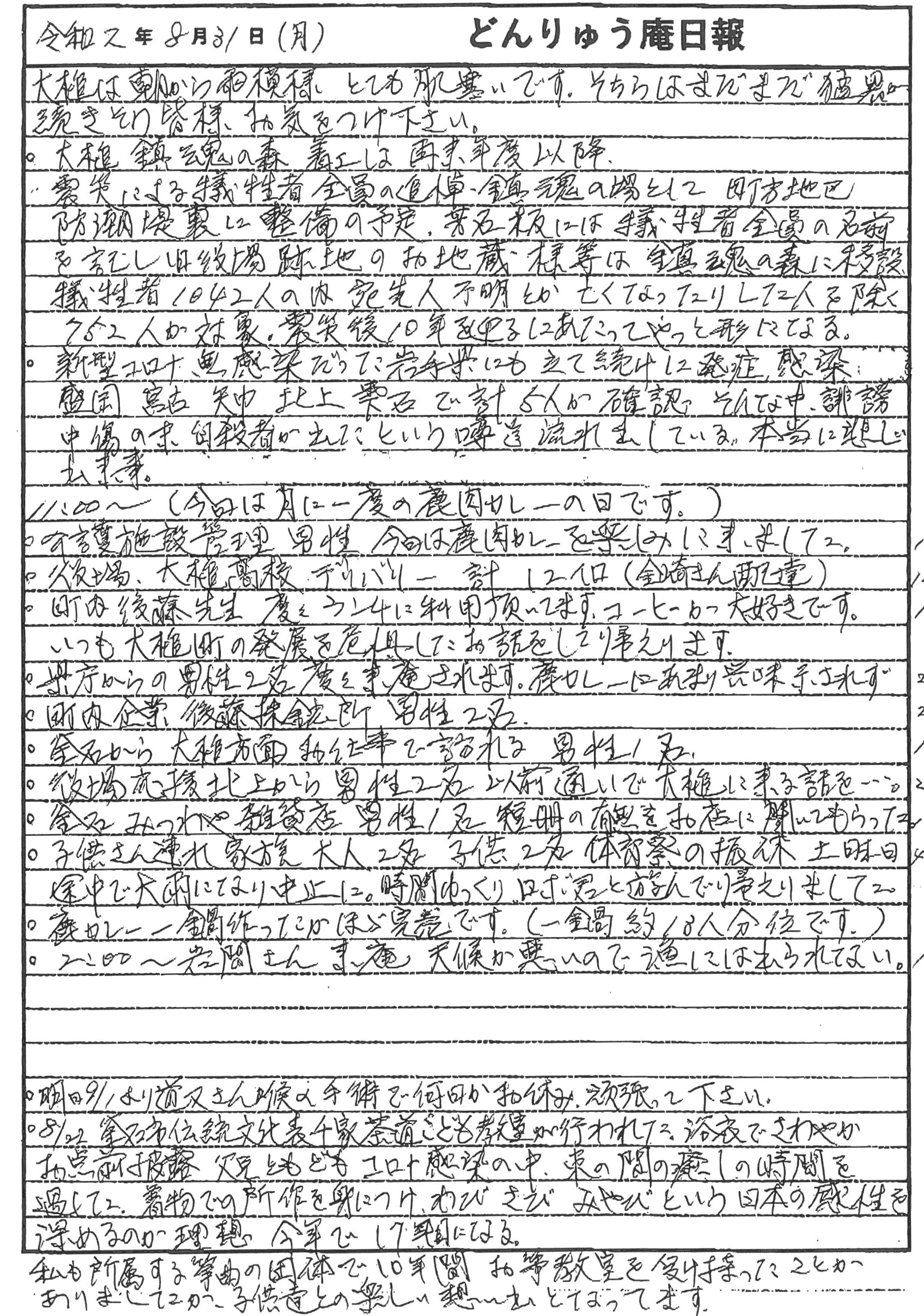 大槌鎮護魂の森着工、岩手県のコロナ感染者発生状況や釜石市伝統文化表千家茶道こども教室や、震災機構直営のコミュニティハウス「どんりゅう庵」のお客様などについて、お嬢こと佐藤悦子特別顧問(岩手県大槌町在住)がレポートします.