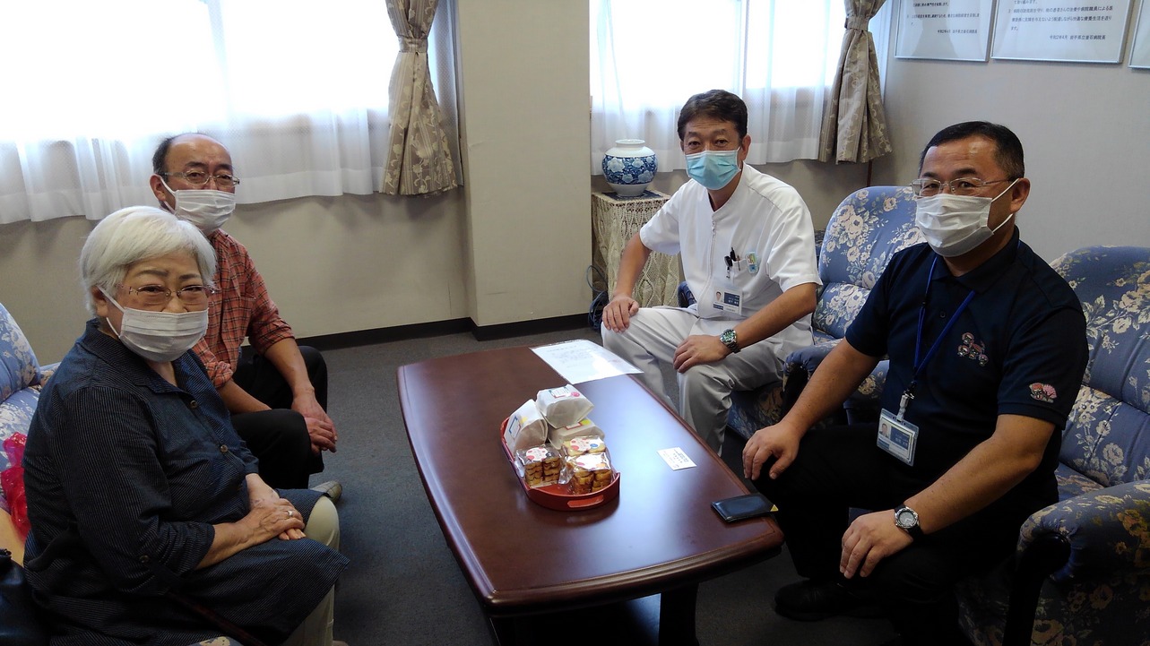 坂下院長(右から2人目)、舘澤事務局長(右)と面談中の佐藤悦子顧問(左)と佐々木工場長(左から2人目)