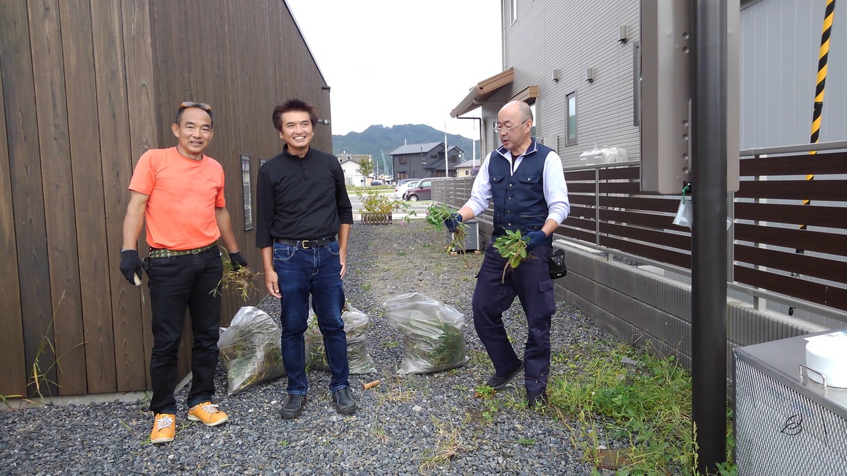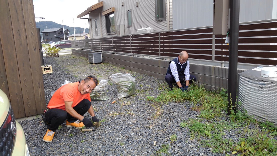 コミュニケーション・ステーションのスタッフによるどんりゅう庵周辺の草取り (中央が植山竜太郎職員)