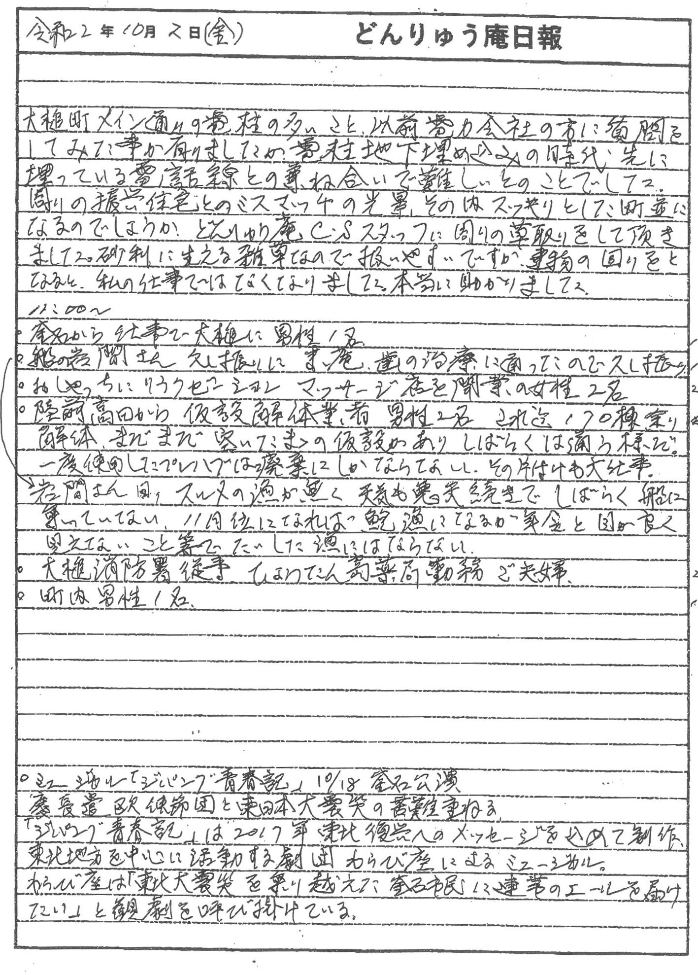 電柱の多い大槌メイン通りや、どんりゅう庵コミュニケーション・ステーションのスタッフによう草取りや、ミュージカル「ジパング青春記」やコミュニティハウス「どんりゅう庵」のお客様について、震災機構のお嬢こと佐藤悦子特別顧問(岩手県大槌町在住)がレポートします。