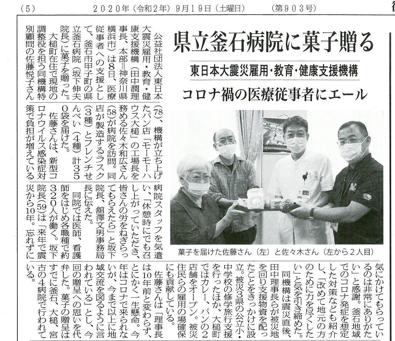 令和2年9月8日(火)、震災機構直営のモーモーハウス大槌が、岩手県立釜石病院にモーモーハウスの人気菓子のフレンチせんべいとモ-モ-ラスクを寄贈した模様が、岩手県釜石市の地域紙「復興釜石新聞」(9月19日付)掲載されました。