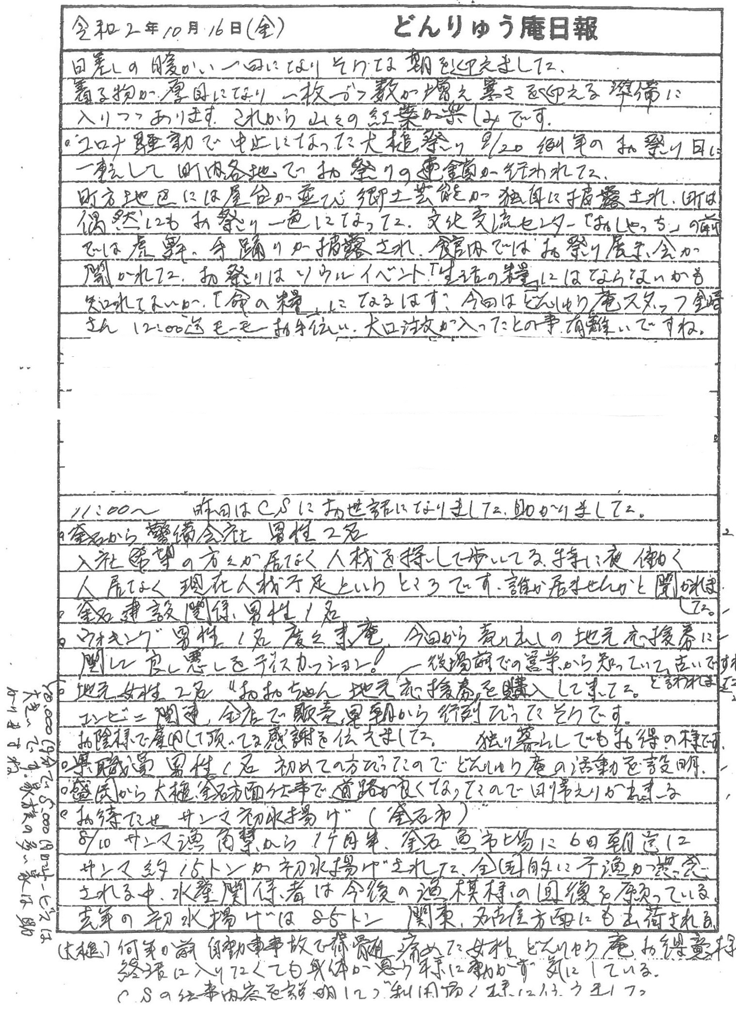 大槌まつりは、コロナのため今年は中止になりましたが、代わりに大槌町内各地で行われた郷土芸能の模様や、釜石港のサンマ初水揚げや、震災機構直営のコミュニティハウス「どんりゅう庵」のお客様などについて、震災機構のお嬢こと佐藤悦子特別顧問(岩手県大槌町在住)がレポートします。