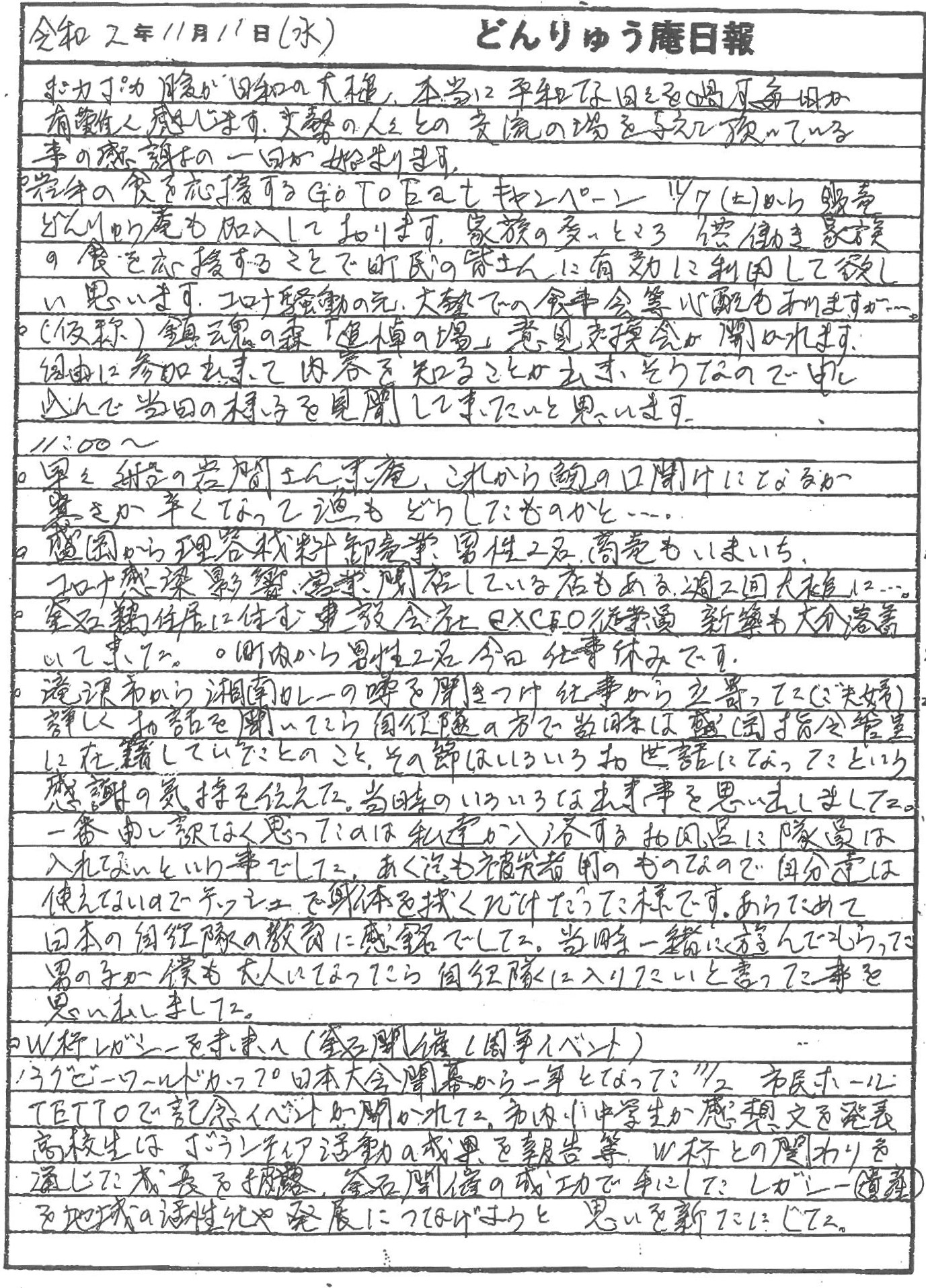 11/7(土)から始まった岩手の食を応援するGoToEatキャンペーンや、鎮魂の森「追悼の場」意見交換会や、ラグビーW杯開催1周年イベントや、震災機構直営のコミュニティハウス「どんりゅう庵」のお客様等について、震災機構のお嬢こと佐藤悦子特別顧問(岩手県大槌在住)がレポートします。