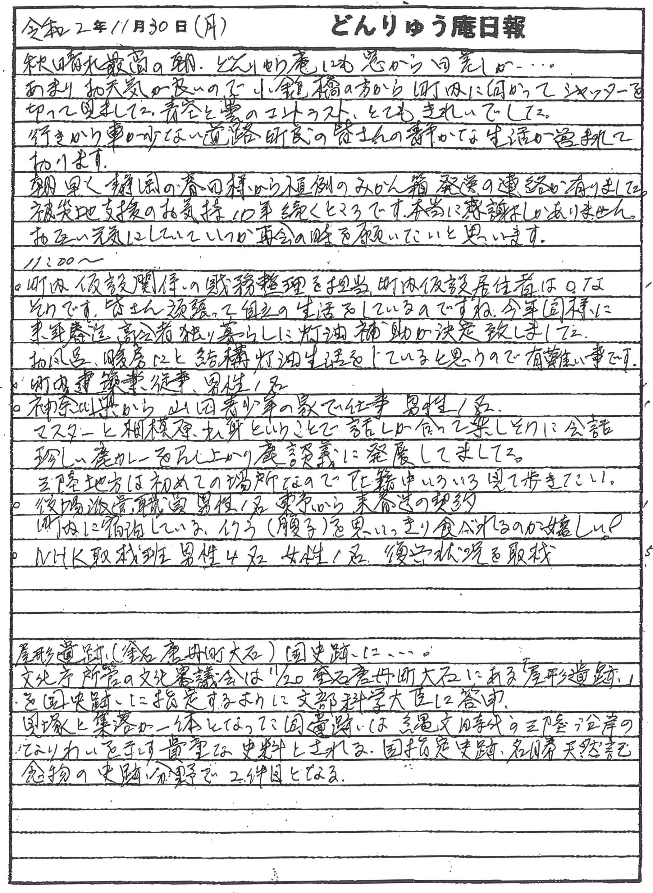 静岡の春田様からの恒例のみかん箱発送連絡や、震災後の復興事業によって出土した釜石市唐丹町(とうにちょう)大石の屋形遺跡が国の遺跡に指定されることになったことや、震災機構直営のコミュニティハウス「どんりゅう庵」のお客様などについて、震災機構のお嬢こと佐藤悦子特別顧問(岩手県大槌町在住)がレポ-トします。