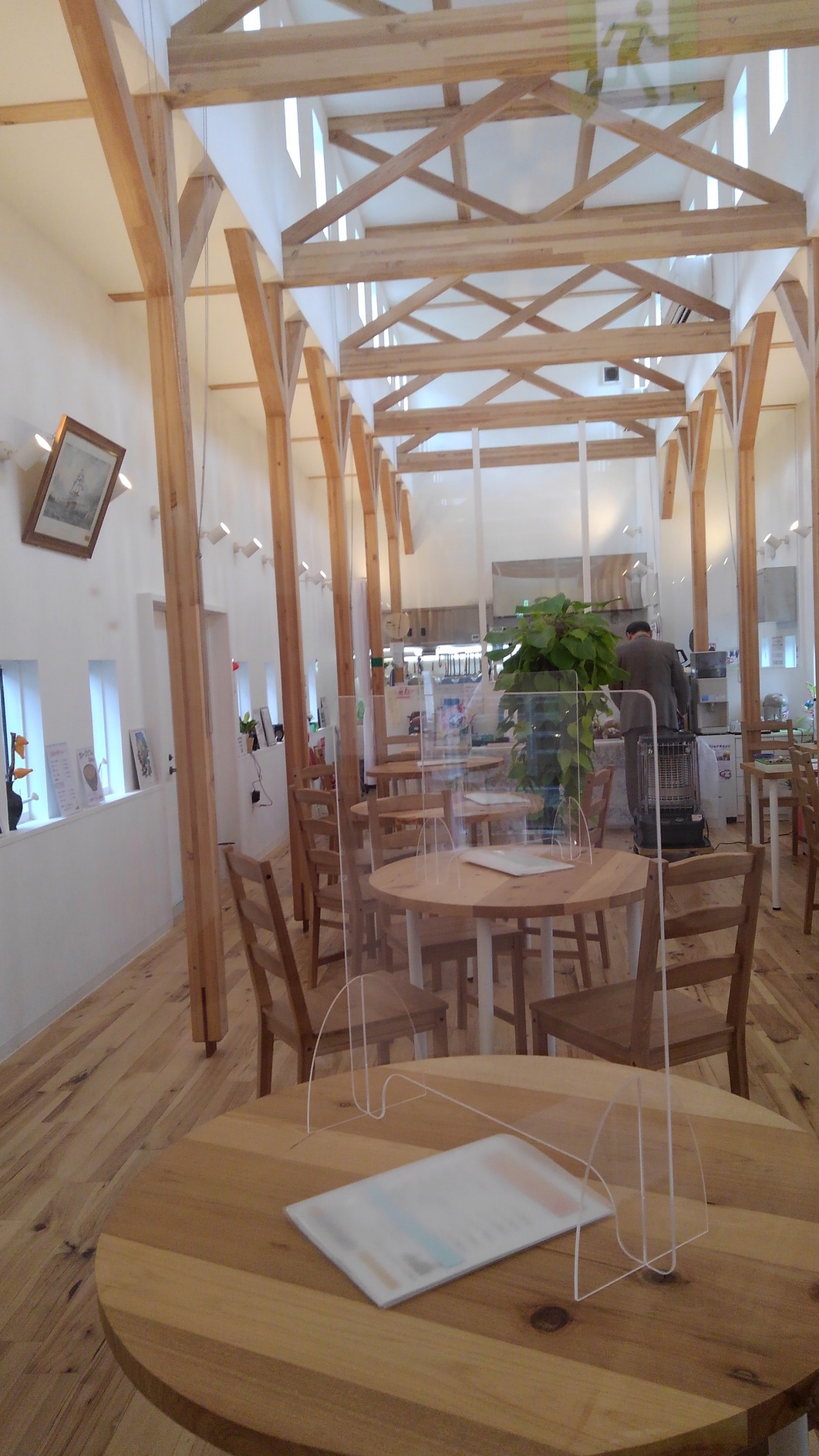 新型コロナ感染症対策として、丸テーブルにシールドが設置されたコミュニティハウス「どんりゅう庵」