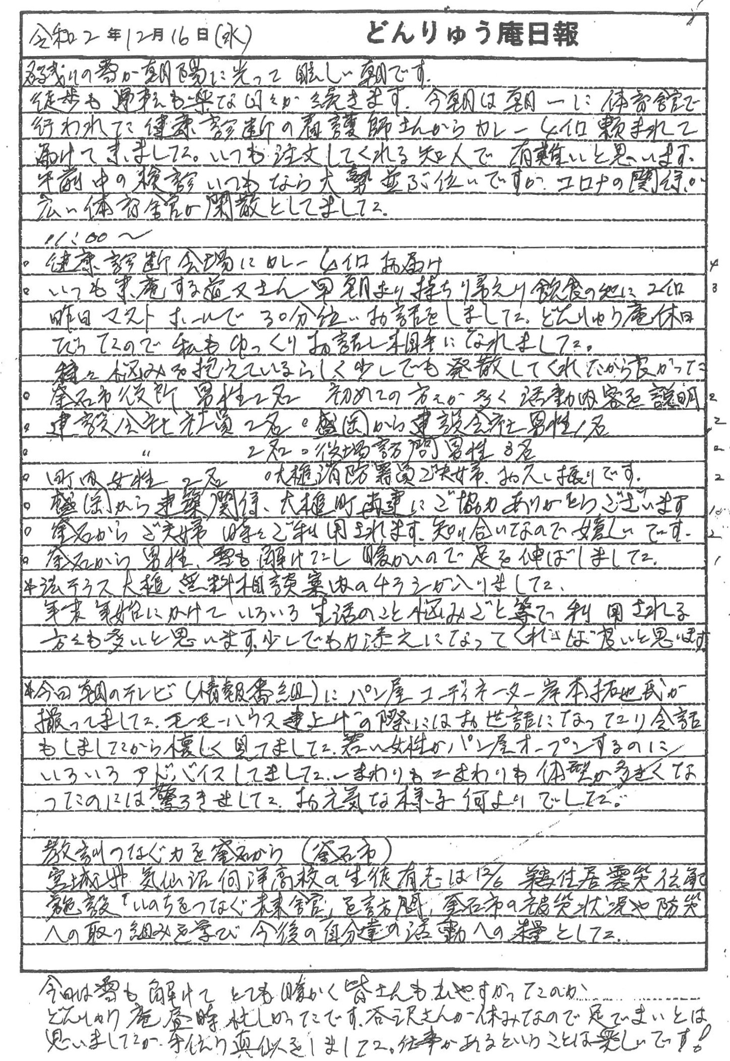 法テラス大槌無料相談案内、モーモーハウス立ち上げ時にお世話になったベーカリープロデューサー石本拓也氏のことや、宮城県気仙沼向洋高等学校の生徒有志による釜石の鵜住居(うのすまい)震災伝承施設「いのちをつなぐ未来館」訪問や、コミュニティハウス「どんりゅう庵」のお客様などについて、震災機構のお嬢こと佐藤悦子特別顧問(岩手県大槌町在住)がレポートします。